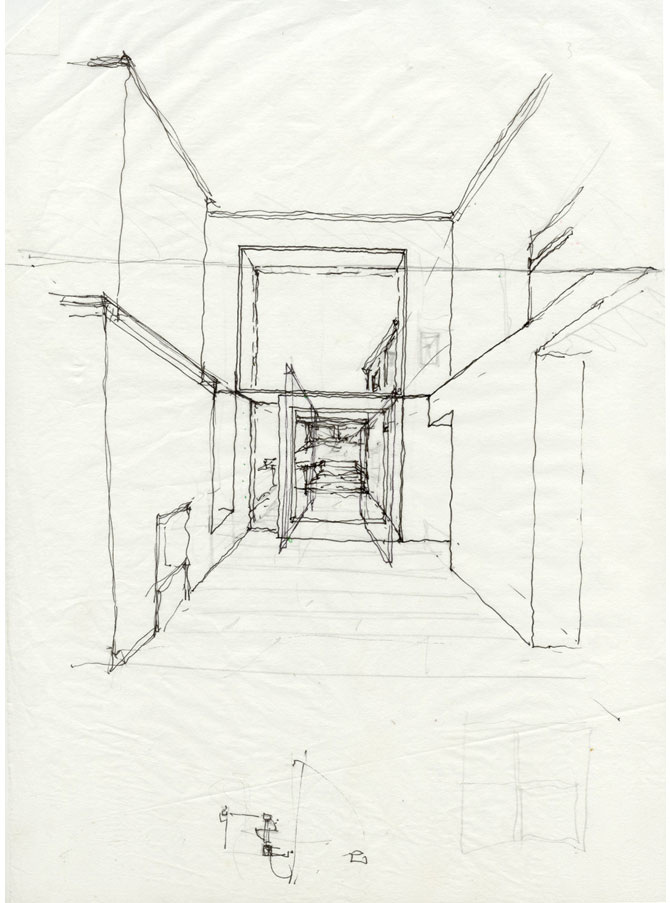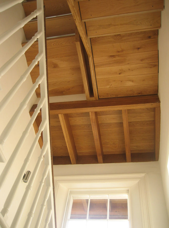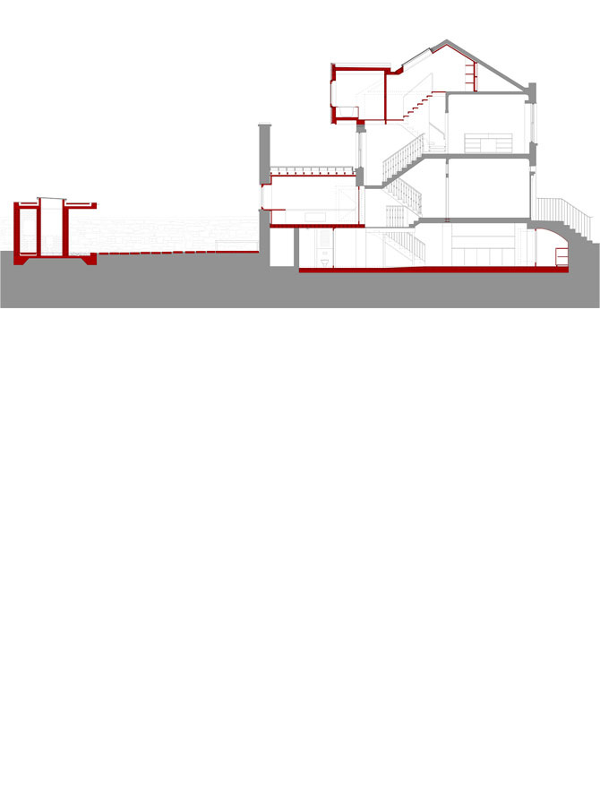 A copperclad box is inserted at upper stair landing to provide bathroom. A concrete roof spans between garden walls to make a garden room using brick taken from the rear elevation.