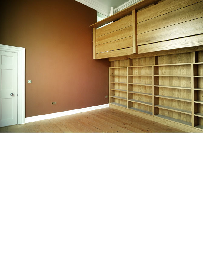 The conservation of a derelict end-of-terrace Georgian house in Mountjoy Square. The creation of a roof terrace to replace a burnt-out bedroom within the existing envelope, and the careful insertion of services as part of fitted furniture allow the building to revert as a dwelling.